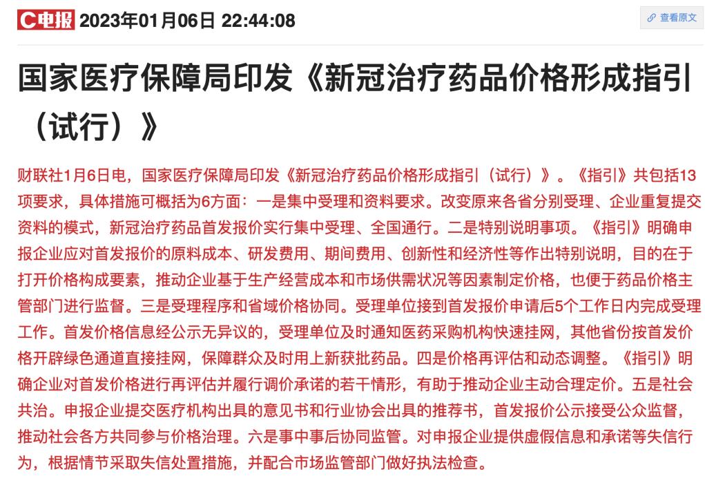 同时,1月6日,国家医保局对外发布了《新冠治疗药品价格形成指引(试行)》提出,引导企业公开透明合理制定新冠治疗药品价格。对此有企业人士认为,这对正在开发新冠口服药的企业而言,属于中性偏负面消息,意味着后续上市的新冠口服药利润将不会太高。