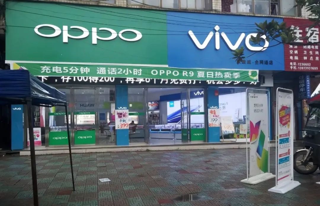 这就不得不提到蓝绿大厂的线下战术了,因为蓝绿的线下店铺普及率高得离谱,你可以在大街小巷任何一个角落见到 vivo 和 OPPO 的实体店。