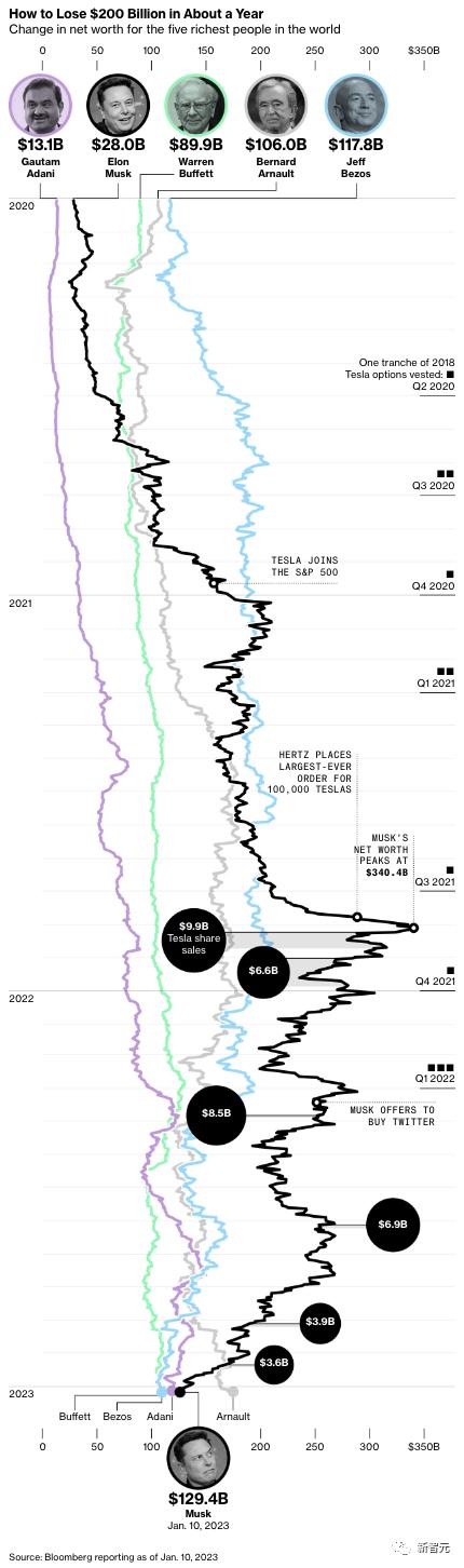 2022年给了马斯克一记暴击——财富缩水打破吉尼斯世界纪录,成为历史上第一个财富蒸发超2000亿美元的人。