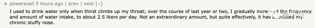 以前只有口渴才喝,最近一两年里增加了喝水频率和总量,一天约2.5升,最后居然缓解了慢性鼻塞。