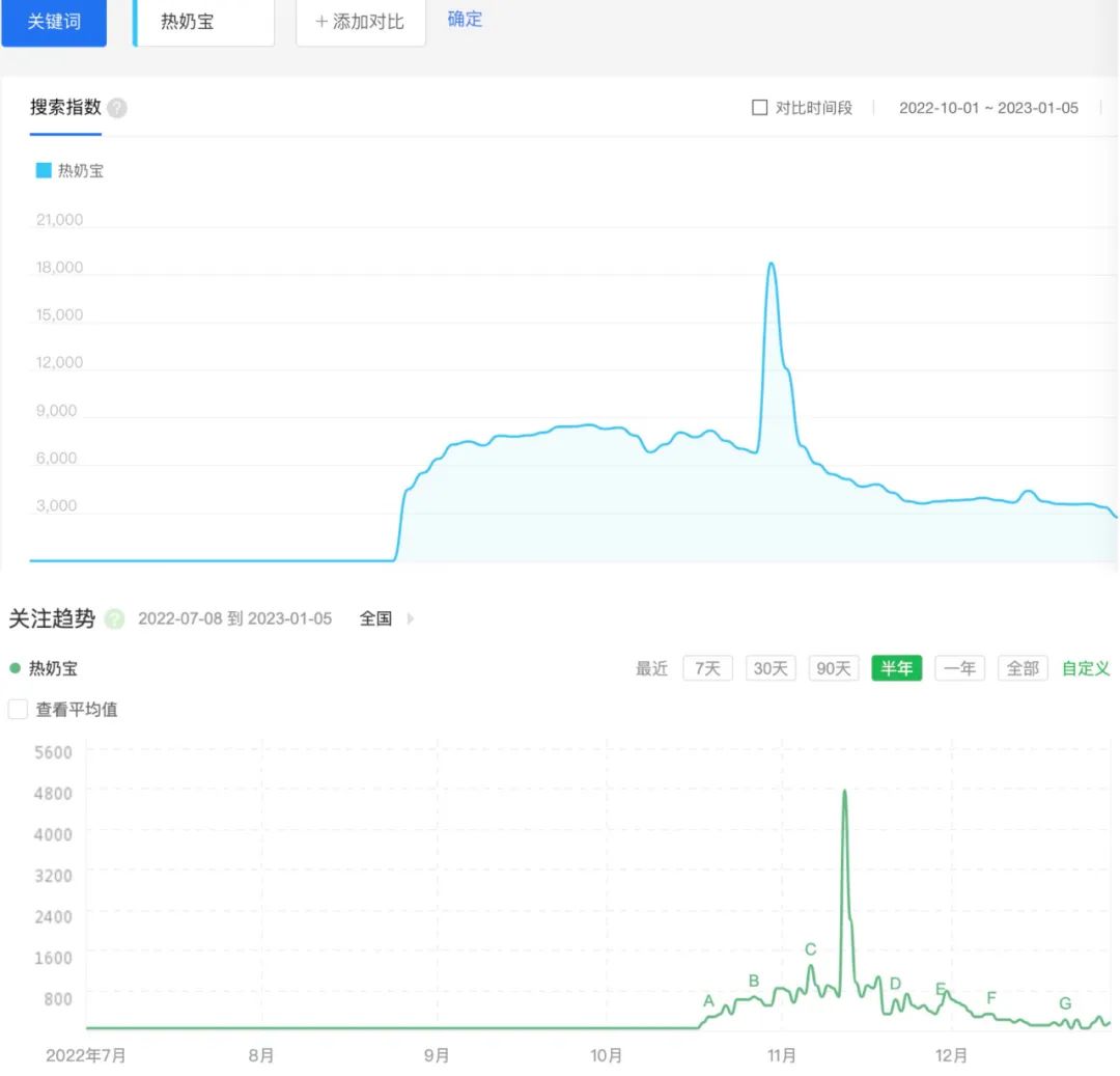 百度指数和360指数忠实地记录了热奶宝的“飞升”过程。