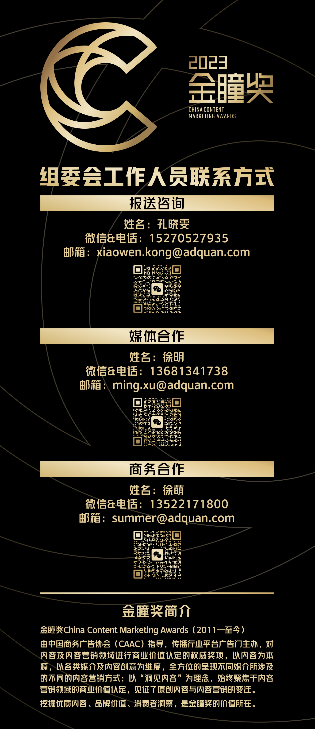 身处这样的时代,我们见证风起云涌。新的一年,金瞳奖继续聚焦行业,也期待在不断变革的洪流之下,更多“超级内容玩家”熠熠生辉,精彩好案例一鸣惊人,期待这个时代成为内容、创意的黄金时代。2023金瞳奖正式启动,作品报送通道现已开启: