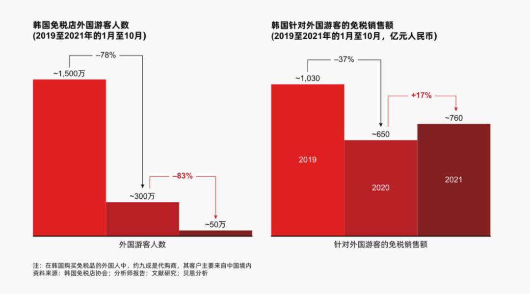 在贝恩咨询的调研中发现,2021年,尽管入境韩国的外国人数锐减,但针对外国人的免税品销售额反而增长了17%,其中九成都是来自中国的代购们贡献的。