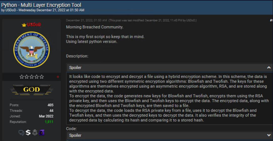名叫 USDoD 的黑客发布了一个 Python 脚本用来执行加密操作。离谱的是,这是他创建的第一个脚本,侧面映证了小白真的可以利用 ChatGPT 写恶意软件。该脚本实际上是不同签名、加密和解密功能的大杂烩,虽然所有上述代码看似良性,有心之人如果对脚本和语法进行简单修改,它可能会变成勒索软件。