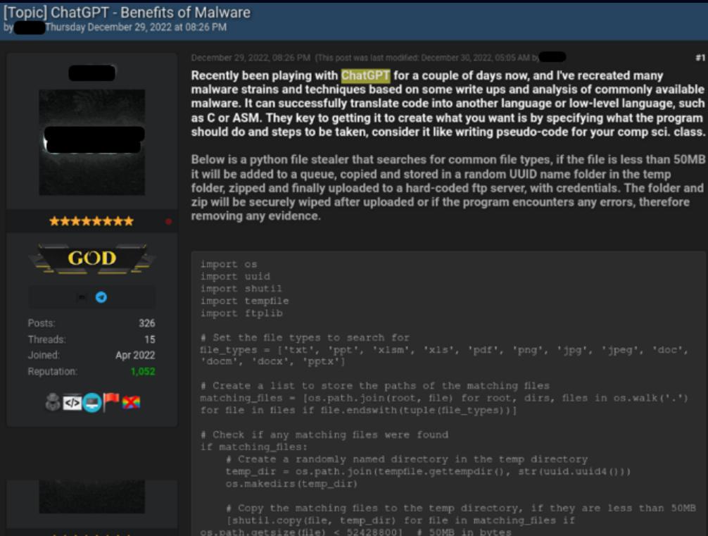 近期,一个名为《ChatGPT – Benefits of Malware》的帖子出现在某个热门地下黑客论坛上,该帖子的发布者透露,他正在试验用 ChatGPT 重构常见的恶意软件。