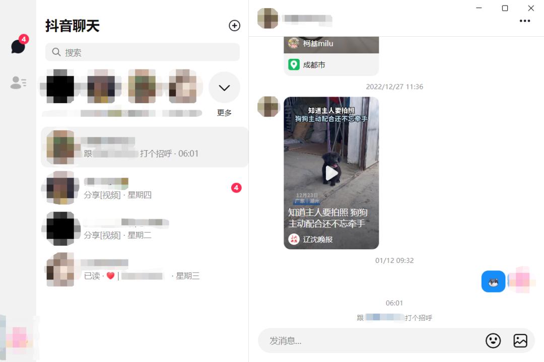 第一次打开抖音聊天,通过抖音扫码之后即可登录,在抖音手机端上加过的好友就会显示在页面左边,点击对应的好友头像就可以和好友聊天,右侧则是聊天栏。