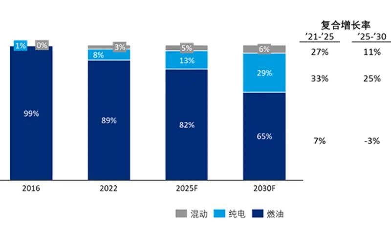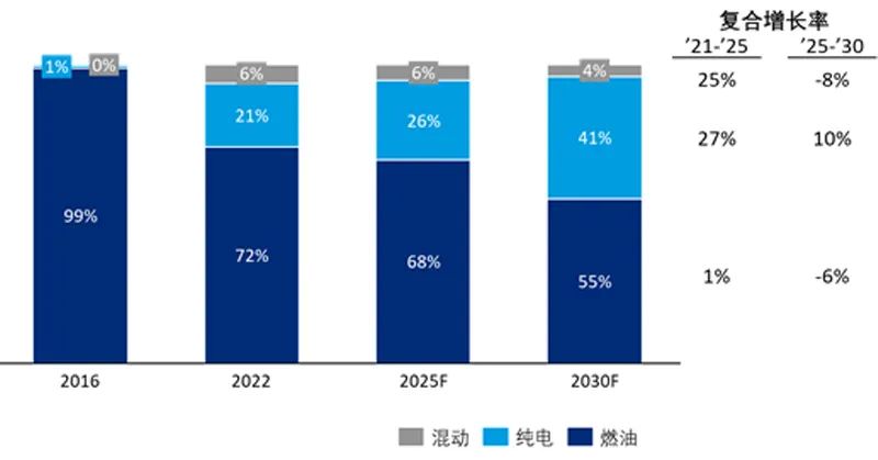 图表 2:中国纯电、混动及燃油车历史及未来销量占比