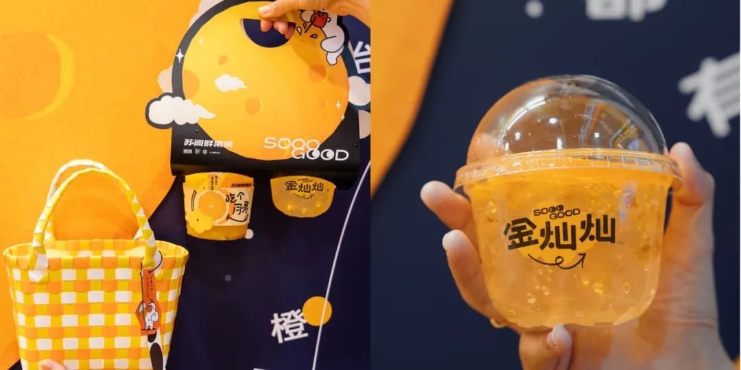 比如“发光奶茶”。中秋节时,苏阁鲜果茶的推出有真橙桂花花和真橙奶椰椰2款产品,点任意一款,加3元就能获得一杯名为“金灿灿”的冰粉杯。