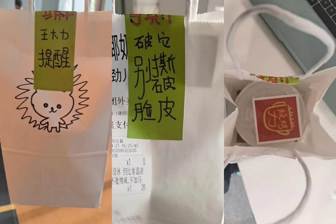外卖包装也让人印象深刻:不仅贴有亲笔画,密封纸还写着“王大力提醒:撕破它别撕破脸皮”。