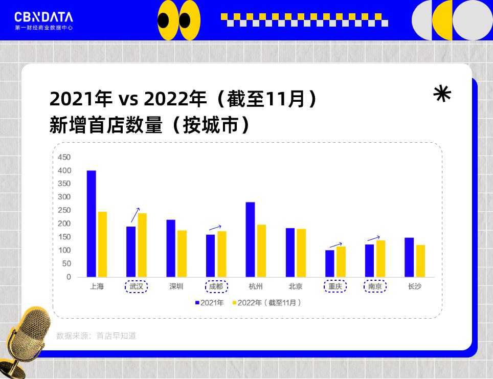 简而言之,首店现象是与区域经济发展密切关联的,据不完全统计,截至2022年11月,华中和西南地区的2022年新增首店数量已接近或超过2021年全年新增数量,而其中的代表城市主要为武汉、重庆、南京和成都。