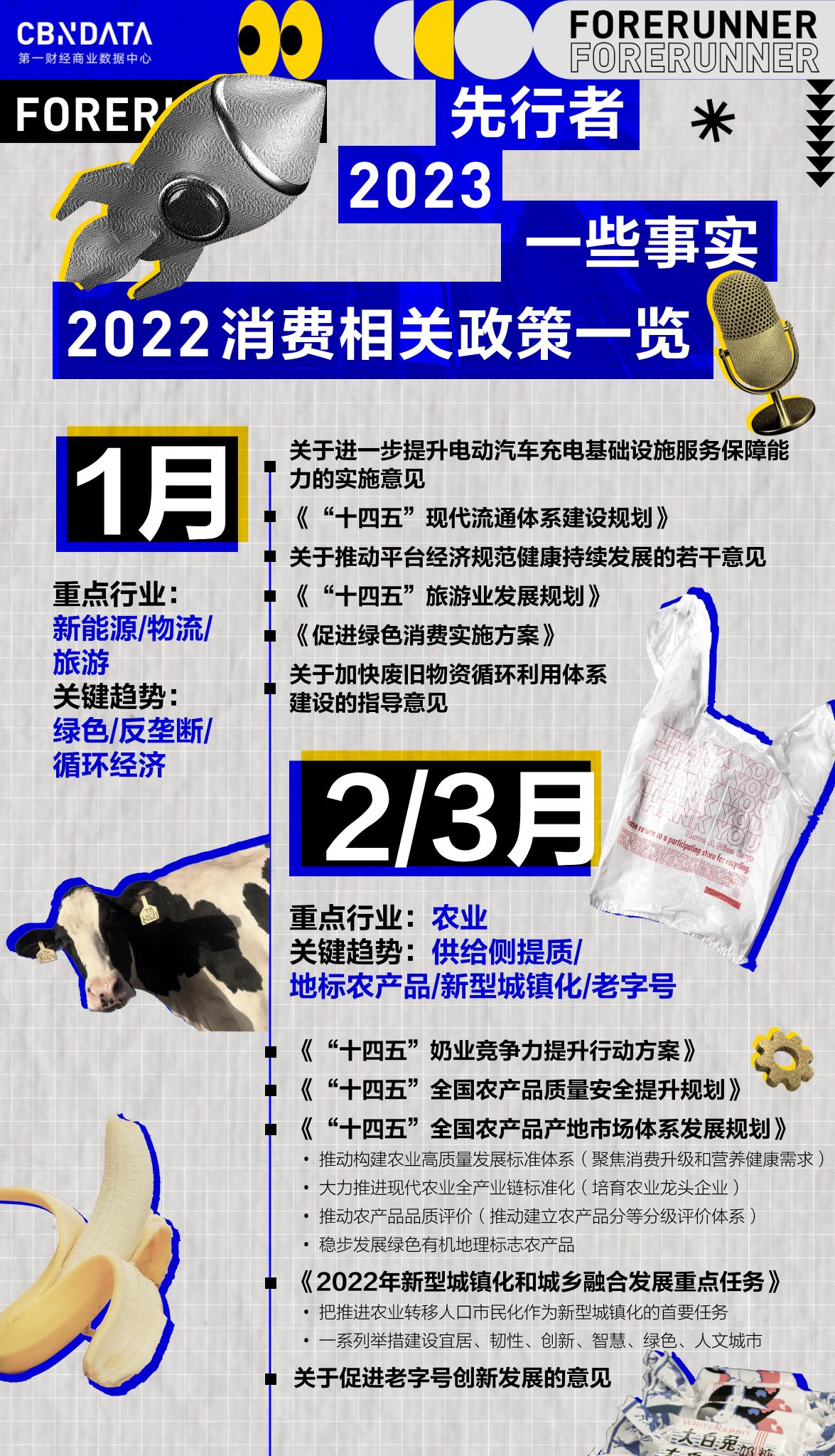 「先行者2023」是CBNData基于对2022主要消费行业数据/事实的盘点,挖掘和识别2023年行业变化/趋势的系列策划。本篇系先行者系列的第一篇,CBNData将从关键政策和大公司动作入手回顾过去一年的一些事实,尝试提取出这一年来消费市场的关键信息。