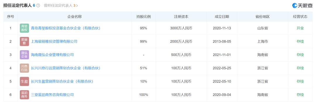 天眼查显示,车一鸣早期曾在远洋红星、红美网络、红美电商等“红星系”企业任职。如今,她已经能独当一面,在6家企业担任法人,多涉及投资管理、营销策划、商务咨询等领域。