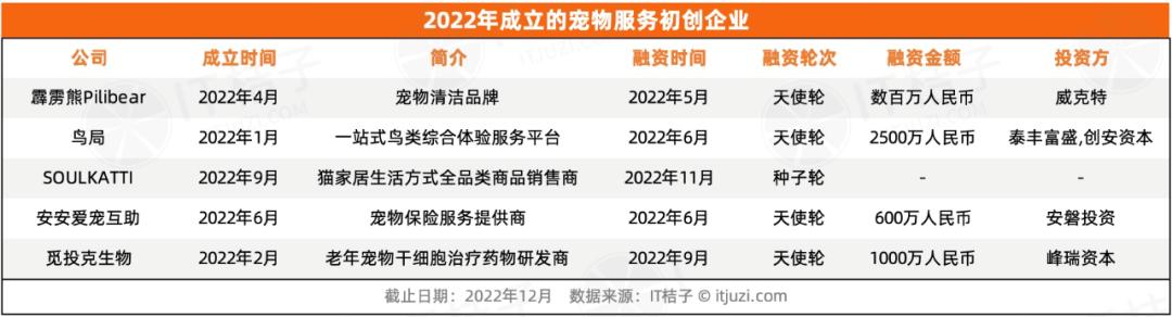 IT 桔子数据显示,2022 年内中国新成立了 5 家宠物服务企业,主要覆盖宠物商品、宠物清洁、宠物保险及宠物干细胞治疗等领域。