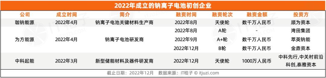 IT 桔子数据显示,2022 年内中国新成立三家钠离子电池企业,覆盖钠离子电池材料和钠离子电池的研发。