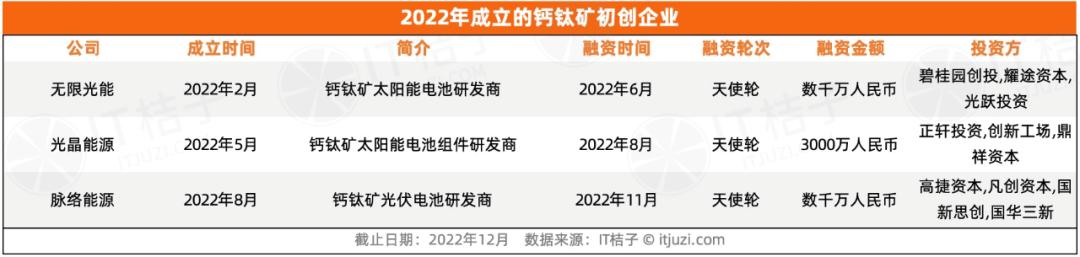 IT 桔子梳理发现,2022 年成立的新经济公司中与钙钛矿有关的公司共有 3 家,且 3 家都于年内完成了天使轮融资。