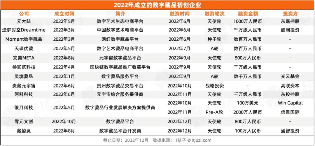 IT 桔子数据显示,2022 年共有 12 家数字藏品的公司获得了融资。其中,数字藏品行业发展解决方案提供商「银月科技」分别于 10 月和 11 月获得了 100 万美元的天使轮融资和 2000 万人民币的 Pre-A 轮融资;贵州数字藏品交易平台「贵藏元宇宙」在 10 月获得了来自高联资本的战略融资;数字艺术生态电商平台「元大陆」获得了东嘉控股 1000 万的创业支持。