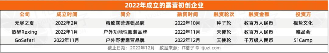 IT 桔子数据显示,2022 年有三家与露营相关的初创企业获得了融资,其中户外野奢露营品牌「GoSafari」获得了来自 51Camp 千万级别的天使轮融资;