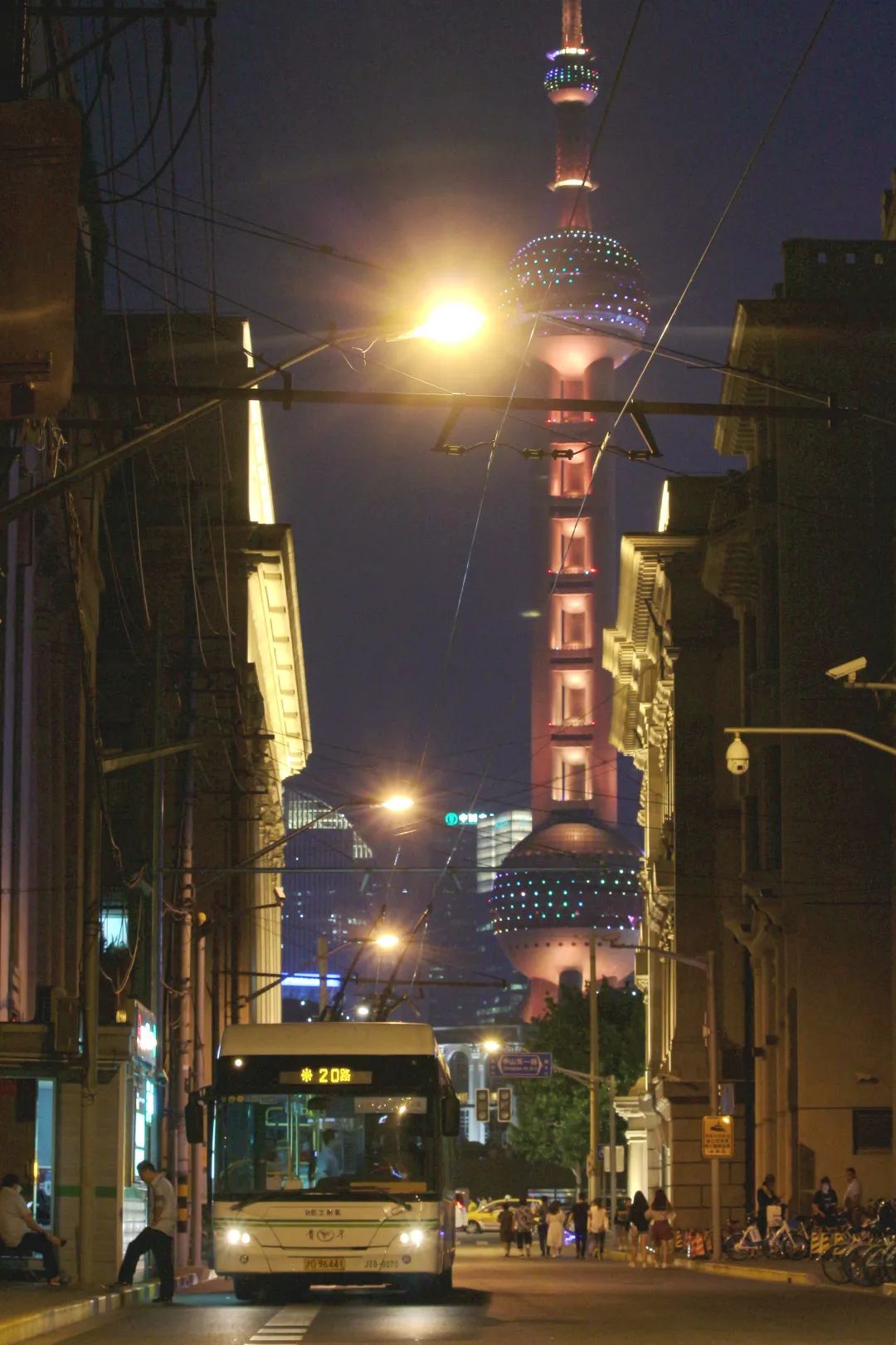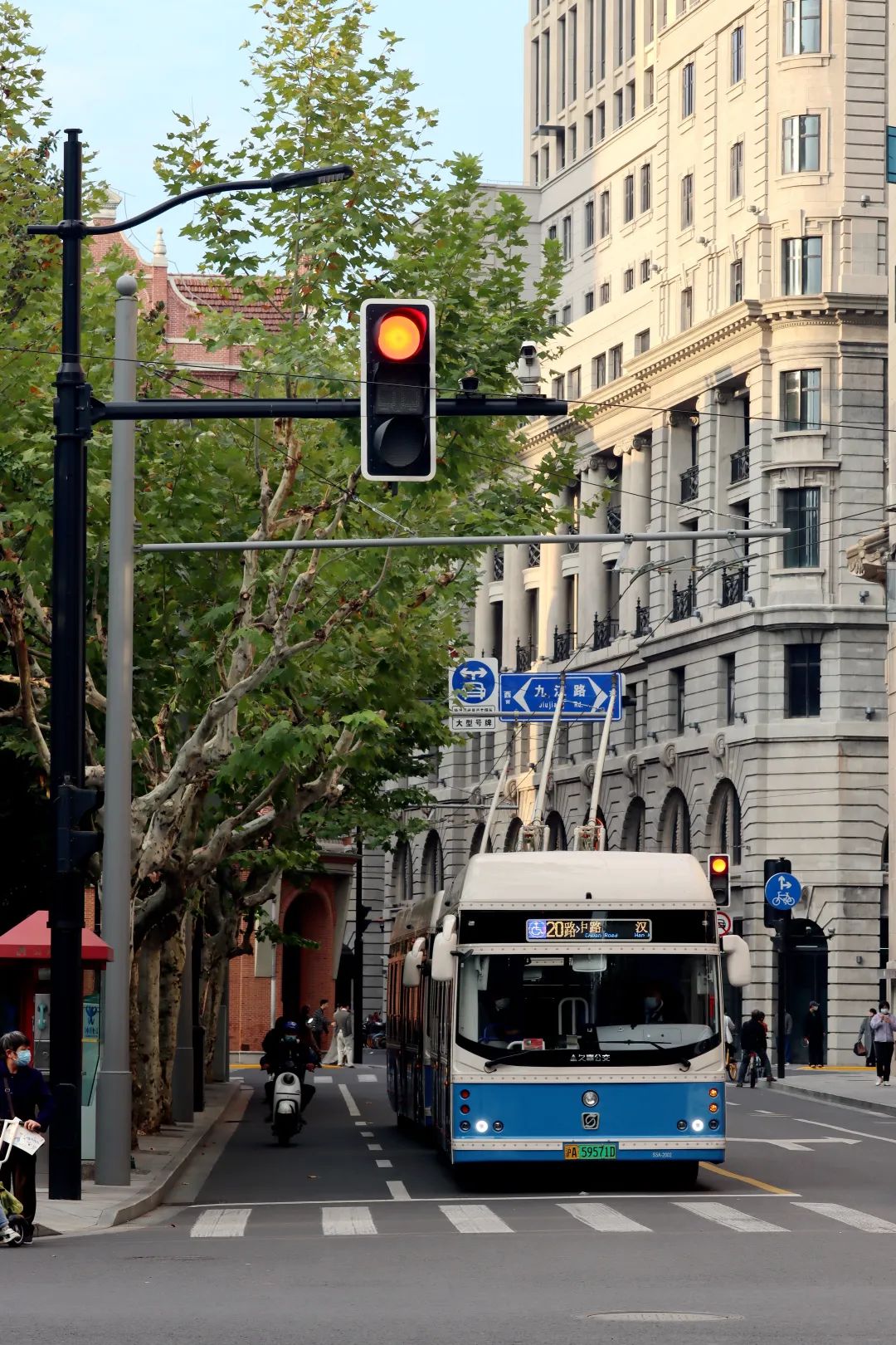 搭乘“辫子车”的旅途是从汉口路四川中路开始的——这是20路无轨电车的始发站,不需要抬头便能望见高耸入云的东方明珠。从这里出发往东走2分钟,外滩的繁华盛景便能尽收眼底。