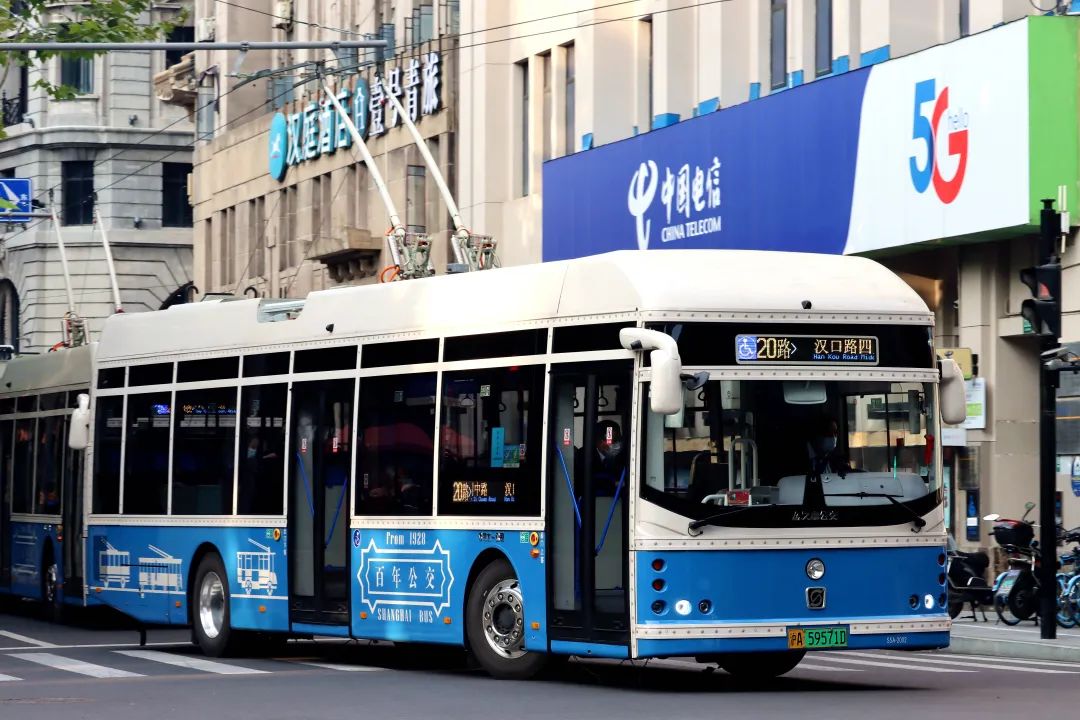 黄浦江畔,各式古典建筑鳞次栉比。楼宇之间,一辆搭着两条“辫子”的20路电车披着蓝白相间的涂装等待发车,车身一侧“百年公交”四个大字,以及上方“1928”的年份,诉说着这条无轨电车线路的前世今生。
