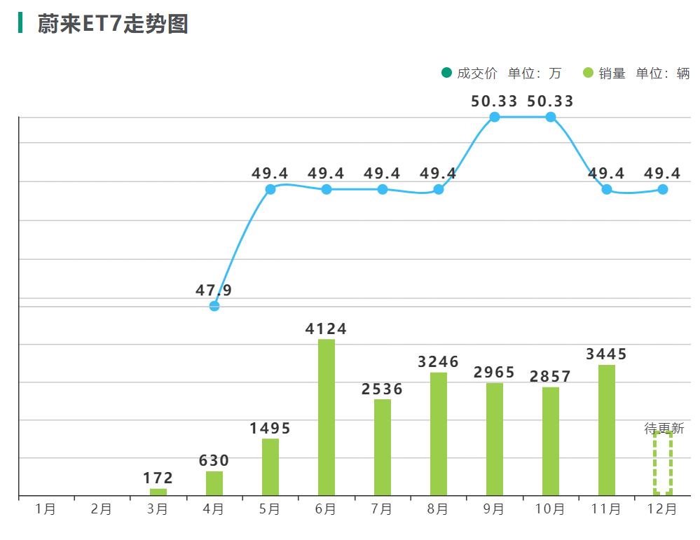以蔚来为例。去年主推的蔚来ET7自上市以来就没有官方降价活动,只有各大线下经销商时不时给予一些优惠折扣。根据新浪汽车大数据中心的统计,除了发售阶段售价曾压到47.9万元的水平外,蔚来ET7的售价一直维持在49.4万的标准线上,9-10月黄金销售期期间一度涨至50.33万元。