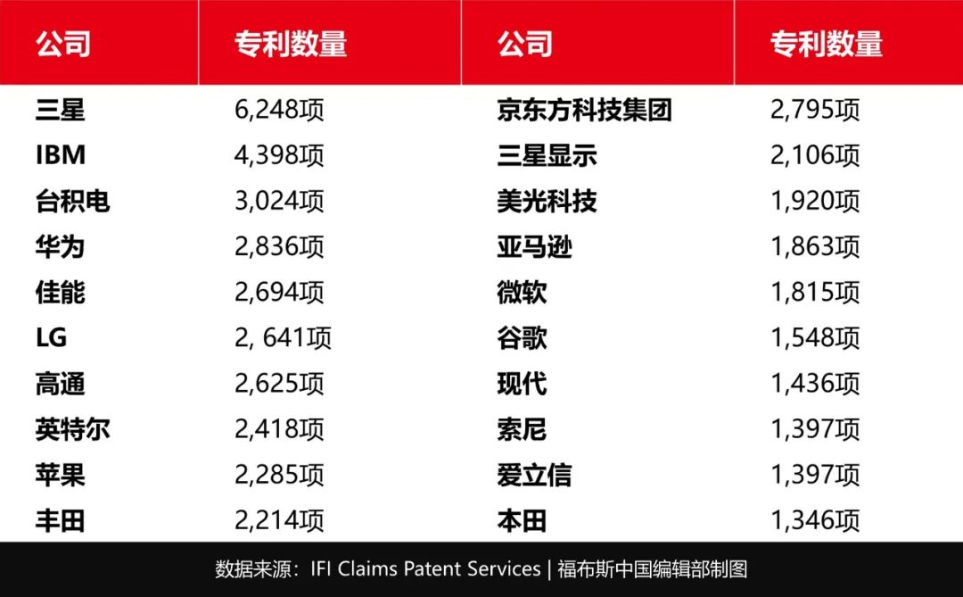 三星的长期竞争对手苹果公司获得了2,285项专利,比去年减少了10%,亚马逊和谷歌则分别获得了1,863项和1,548项专利。