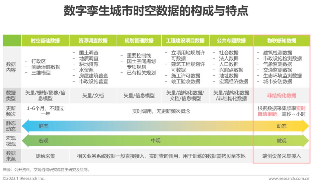 城市是自然与社会深度耦合的复杂系统,包含了自然资源和人造实体的动态、静态要素,要素的数字化、集约化管理形成了城市时空大数据资产。下表中,时空基础数据和相关业务专题数据支撑着真实、精准的城市信息模型构建,物联感知数据沿分布式算力网络流动革新,从“脏数据” 经清洗、加工、标签化逐步蜕变为专题数据以供上层BI分析调用。低质的输入必然导致低质的输出(GIGO),时空大数据的高效管理对孪生系统的价值释放至关重要,是使能北向应用的数字底座。此外,海量、多维、实时、非结构化的时空数据累积将对未来城市IT基础设施建设提出新要求。