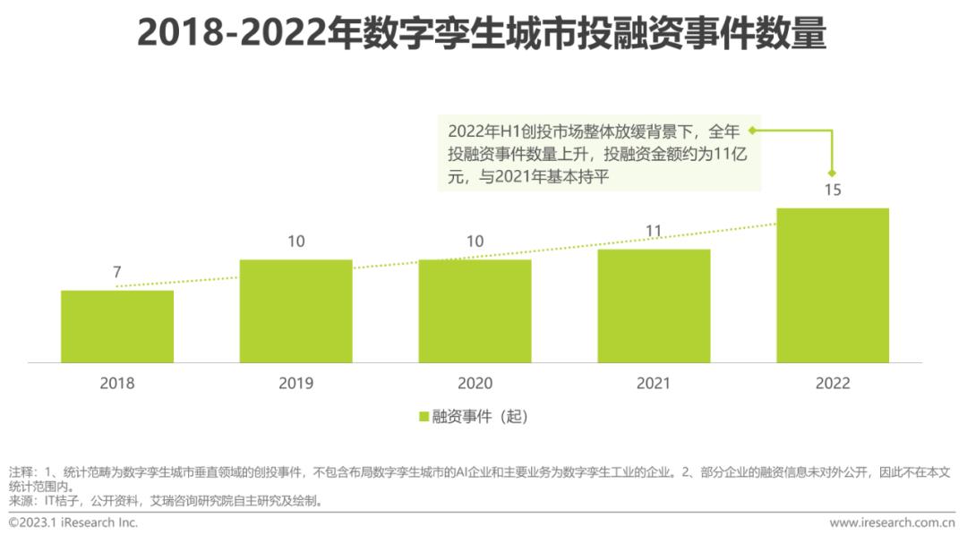根据不完全统计,2022年数字孪生城市市场融资事件达15起,行业融资情况呈向好态势并升至高点。资本市场上,多家专注于数字孪生技术城市空间应用的初创企业获得了大额融资,明星机构、政府引导基金和产业资本均有布局。值得关注的是,广联达和腾讯作为产业资本动作频频,其中腾讯先后布局CIM平台、云渲染平台、时空大数据等多类型厂商,践行时空AI战略;广联达基于BIM技术和建筑领域的积累构建数字孪生生态,提供CIM平台建设服务。