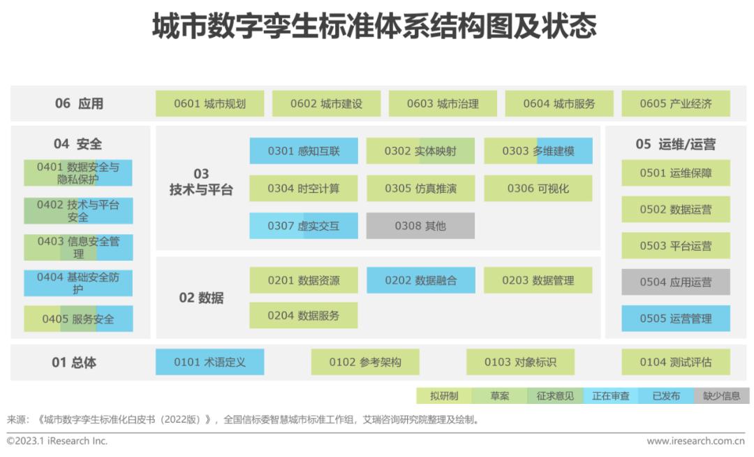 2021年3月,全国信标委智慧城市工作组成立了城市数字孪生专题组,负责城市数字孪生标准体系和关键标准研究,推动标准试验验证与应用示范工作。目前已完成国内城市数字孪生标准第1部分:技术参考架构的预研究工作,进入国家标准申报流程。城市数字孪生标准体系结构图由“01总体”“02数据”“03技术与平台”“04安全”“05运维/运营”“06应用”六部分标准分体系组成,参考单一标准状态,技术与平台标准和安全标准进度相对靠前,应用标准进度相对滞后。