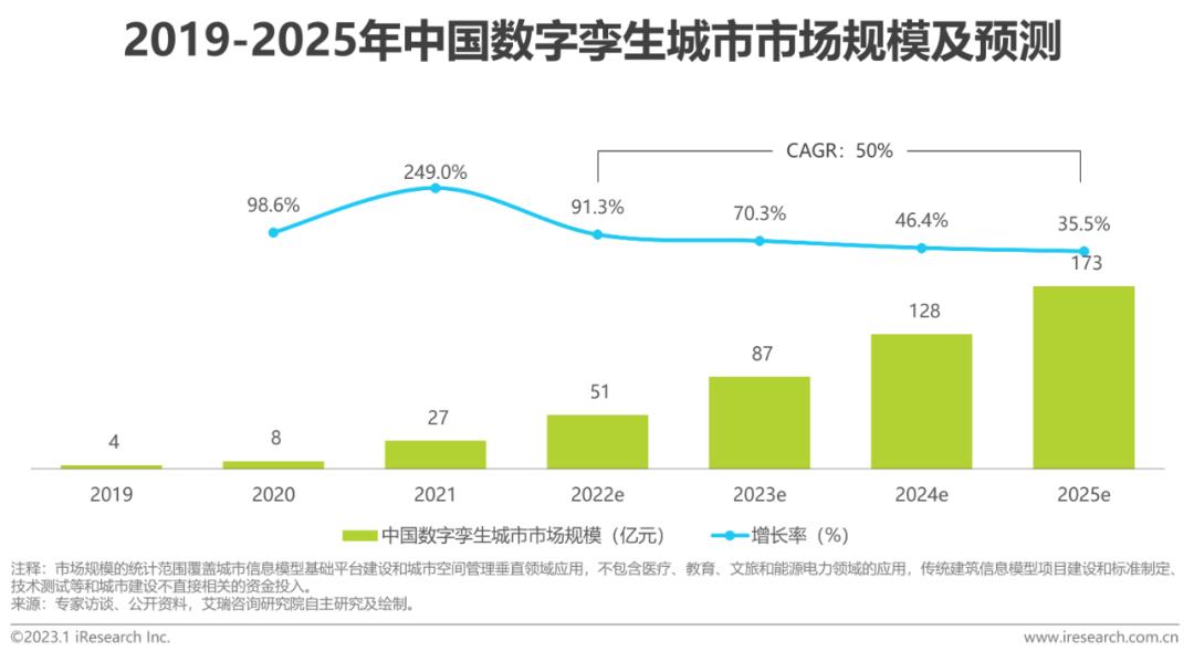 •市场规模:2022年中国数字孪生城市市场规模为51亿元,年复合增长率达50%,城市信息模型基础平台和场景化应用同步落地