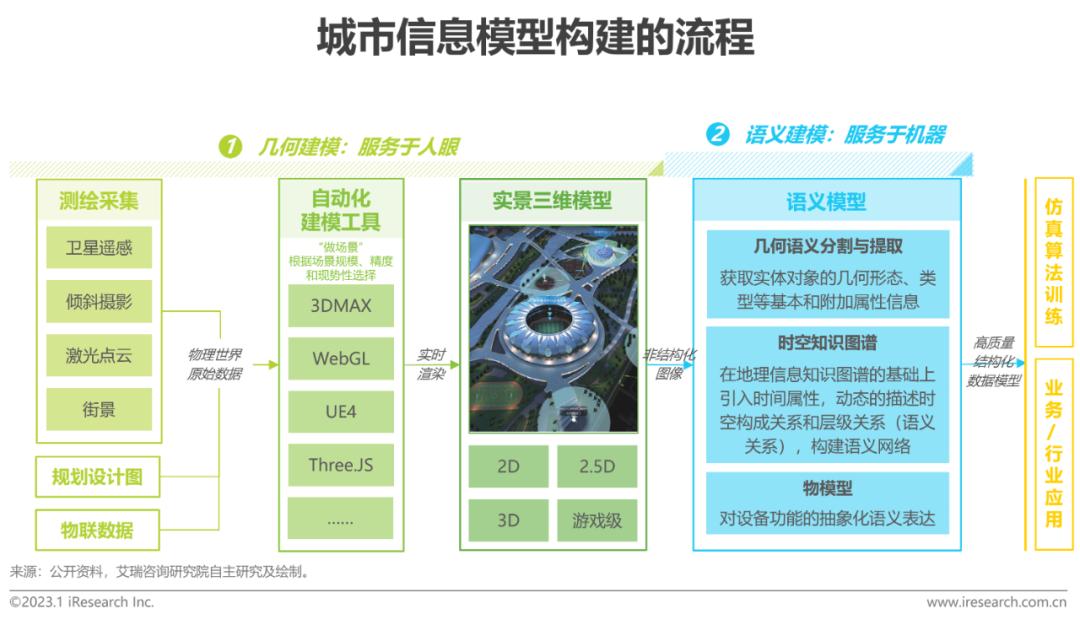 提到信息建模,有人将其与可视化大屏划上等号,这无疑是管中窥豹,关注了数字孪生的表象与形式,忽视了其本质与内涵。 数字孪生城市信息模型(简称CIM)由实景三维模型和语义模型共同构成。空间几何建模是对物理世界三维立体结构和外观的数字表达,是服务于人类浏览和理解的人机交互界面,更注重模型的精度、还原度和准确性。语义模型是在三维模型基础上对物理世界的深度理解,提炼信息、总结规律、构建时空知识图谱,满足AI算法开发和信息检索。实景三维模型是CIM的空间基底,语义模型是CIM建设的根本目的,服务于高阶的机器学习算法训练。几何建模在摄影测绘和计算机辅助设计等领域已有长期的技术和实践经验积累,技术难点在于高精度模型的成本控制;语义建模技术尚不成熟,有待行业实力玩家探索定义。