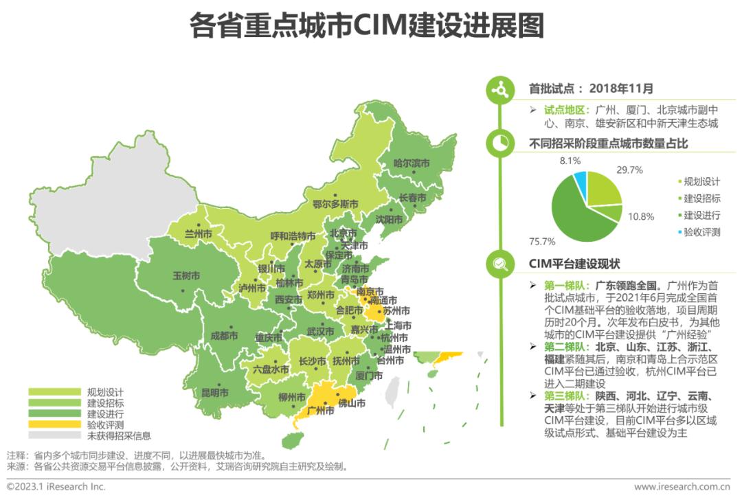 住建部牵头的城市信息模型平台建设是数字孪生城市的建设重点,基于CIM平台的行业应用将加速规模扩张。目前大部分省份已开始试点城市市级CIM平台的一期建设,广东、江苏等经济发达省份已建立标杆指导,场景化应用同步推进。