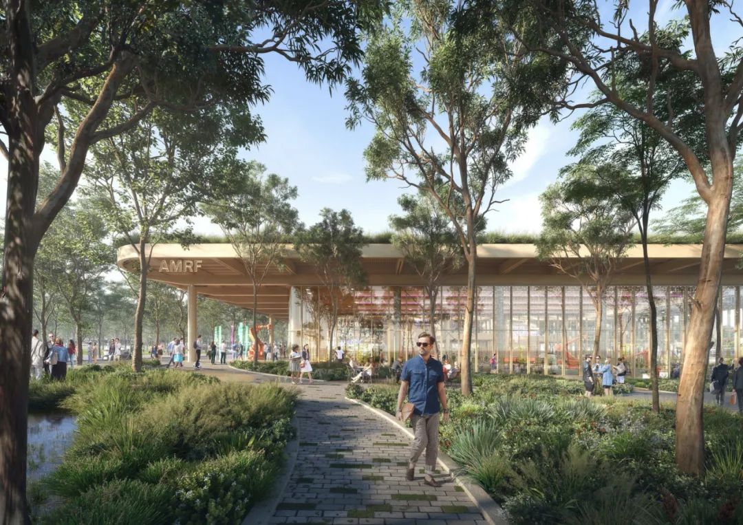 悉尼正在进行一场重大的城市转型,那里正在建设一个巨大的区域,以服务于该城市的新国际机场,并从中受益。希望名为西悉尼航空城的区域能够成为科学、技术和创意产业的经济中心,在未来 30 年内创造 10 万个新的就业机会。航空城的第一座建筑——被命名为先进制造研究设施(AMRF)第一大楼,计划于 2023 年底完成,作为游客中心和更广泛的发展的枢纽。该建筑由预制木材模块建成,灵感来自于水的流动,充满光亮的设计由建筑公司 Hassell 领导,与原住民文化研究和设计实践机构 Djinjama 的原住民设计师 Danièle Hromek 合作。