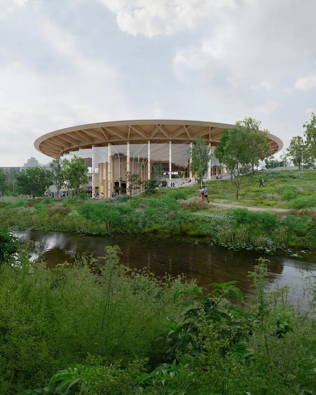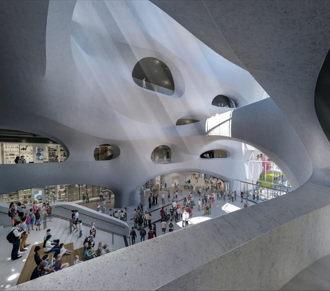 Studio Gang 工作室负责设计了纽约市美国自然历史博物馆新设施——理查德·吉尔德科教创意中心(Richard Gilder Center)。该项目将博物馆的 10 座大楼连接在一起,创造出了一个囊括展览馆、教室和沉浸式数字剧院的巨大园区。该建筑的设计受自然界的地质演变过程启发,如地质峡谷和冰川结构的形成。在此基础上,他们设计了一个由钢筋混凝土制成的起伏状洞穴建筑,其峡谷般的开口和桥梁从视觉上连接了馆内诸多设施。