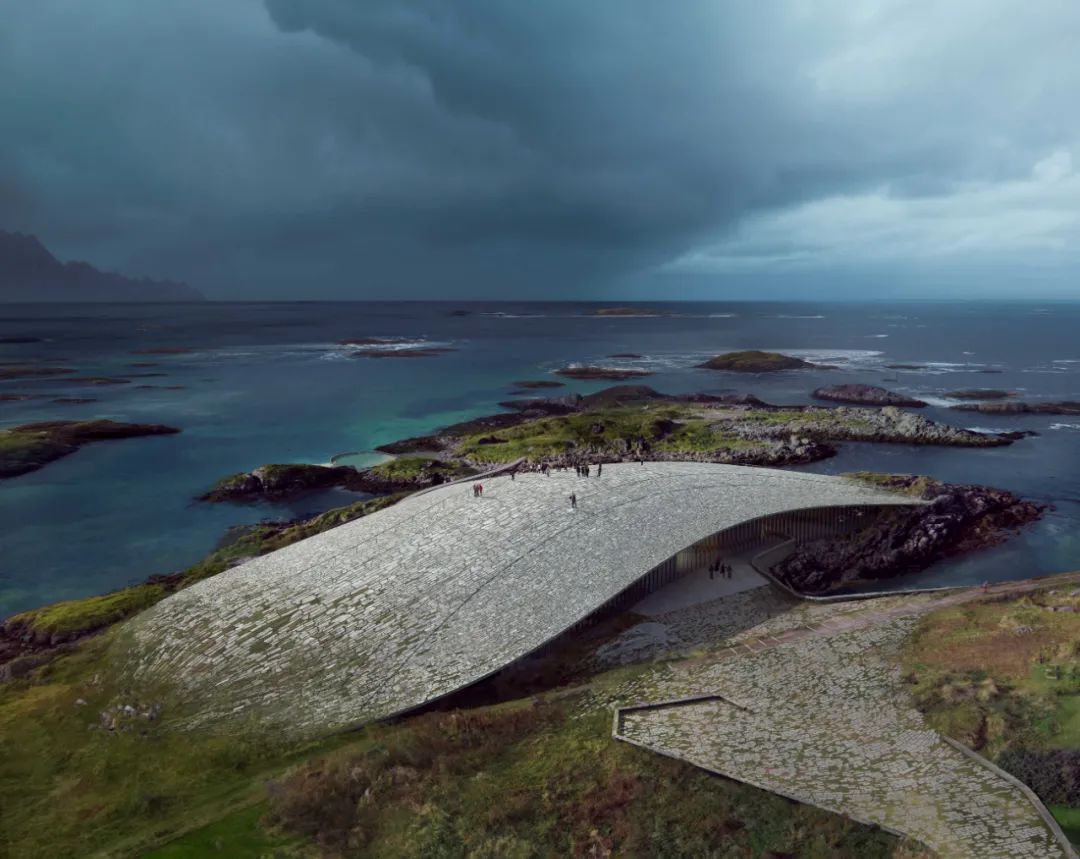 建筑师将该项目视作对基地自然景观的一种延伸,将地面微微隆起,以创造足够的空腔部分。外观慵懒的起伏模样,给人感觉就是一头跃起的鲸鱼。他还以周围的环境为灵感,设计了一个抛物线形的屋顶,并覆以碎石,以模仿自然界的大地外形。起伏的建筑形态,给内部留足了观鲸的宽阔空间。室内玻璃呈竖向长条状,加深建筑给人的垂直空间感。而从建筑的平面上看,室内设计了曲墙,像是鱼儿游走的路线。中心将包含展览空间、办公室、咖啡厅和纪念品商店在内的多种空间功能。