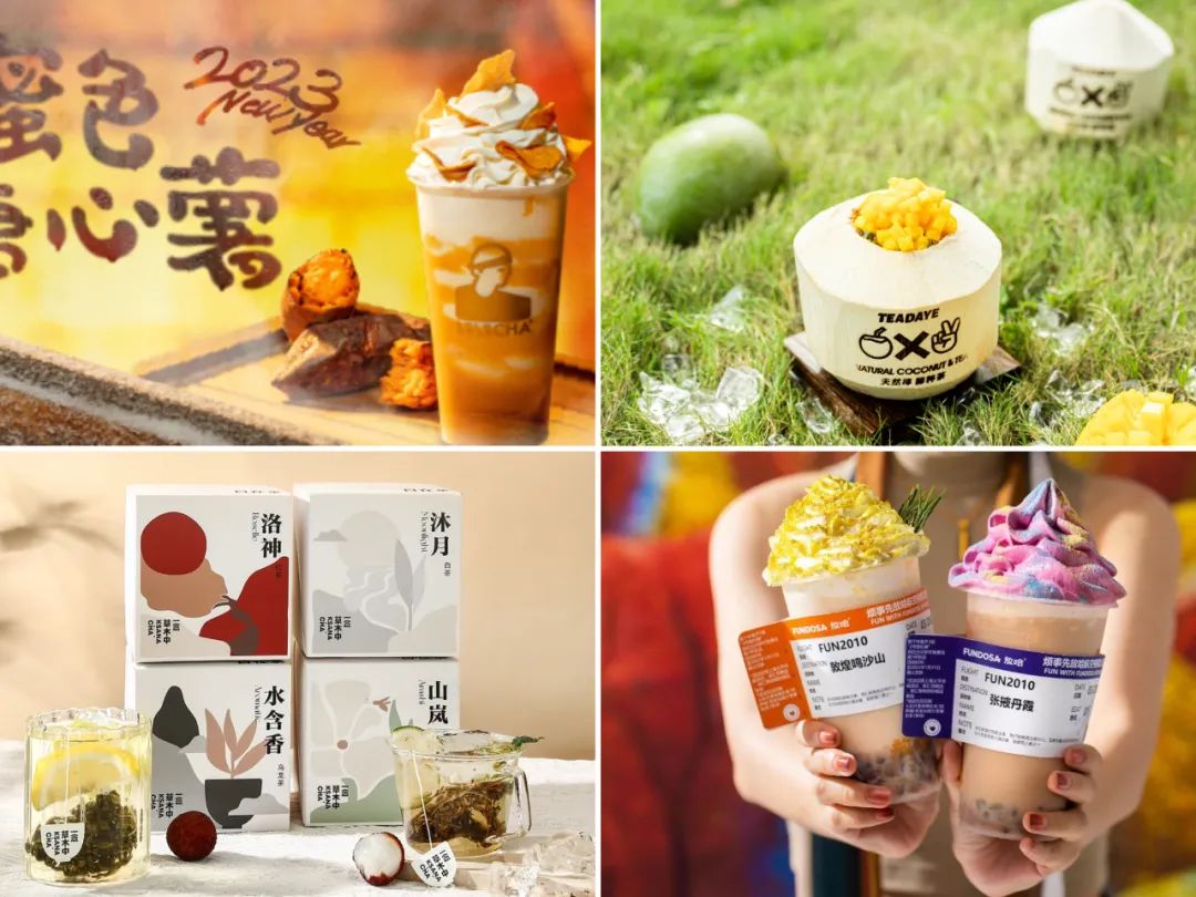 乐乐茶、茶大椰、放哈、一念草木中(从左上角开始顺时针顺序),图片来源:品牌官方