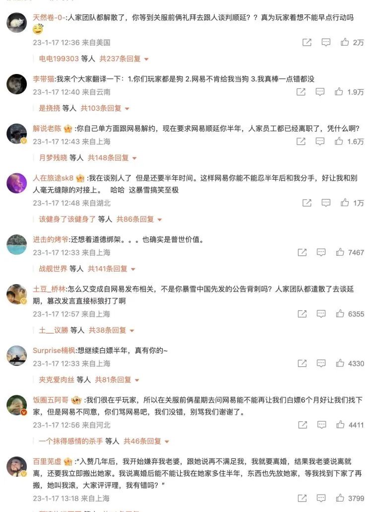 更何况网易和暴雪继续续约的可能性已经微乎其微,网易何必在暴雪寻找下家的时候帮助他们运营游戏。引用一句NGA一位网友的比喻,这就像是夫妻离婚之后,仍然赖在对方家不走,直到找到下家。显然,网易并不是这样一个冤大头的前任,而玩家们,也不会给如此“高贵”的暴雪一个面子。声明的评论区中大量玩家发表点评,对暴雪如此无耻的行为表达着自己的愤怒。