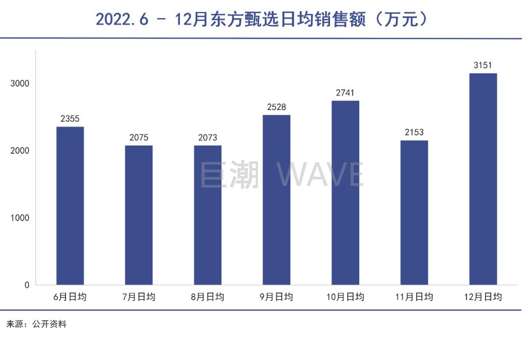 有了粉丝基础后,东方甄选很快扩展品类,将商品种类从农产品扩展到了图书音像、食品饮料、生鲜蔬果、美妆日用品、酒水和旅游产品等领域,并打造了6个矩阵号。而从带货数据来看,2022年6-12月东方甄选日均GMV 2416.1万元,所有账号累计带货GMV则为59.37亿元。