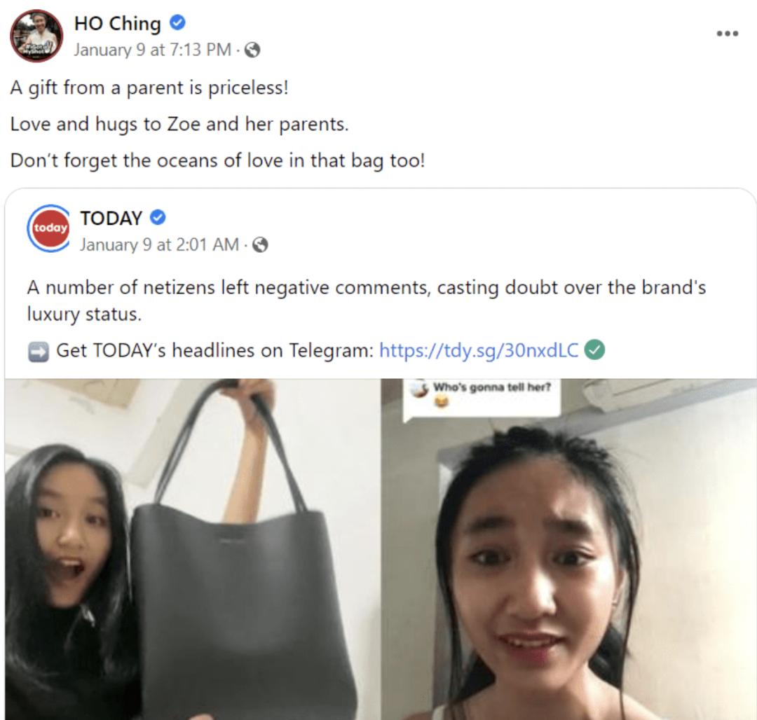 新加坡女孩晒包被嘲笑的话题蔓延到其他互联网语境,引发更多讨论思考。有相似经历的加拿大癌症协会筹款人艾薇·黄 (Ivy Wong) 觉得这件事说明了在特权中长大的人是多么无知,无法和普通人共情。最后,连新加坡总理夫人都加入了这场价值讨论圆桌会。Charles & Keith 更是抓住机会组织参观活动营销了一波。