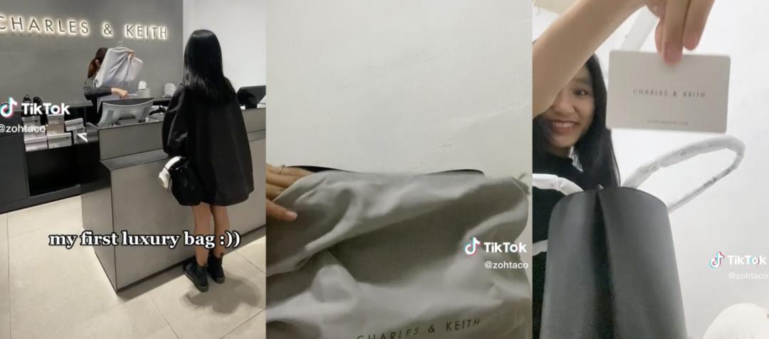 1月8日,17岁女孩佐伊·加布里埃尔 (Zoe Gabriel)兴奋地发布视频展示爸爸为自己购置的“第一个奢侈品包包”,并配文“谢谢爸爸”。视频中,她给了 Charles & Keith 包奢侈品般的待遇——视频记录提货、和包装袋合影、详细展示开箱和佩戴效果。