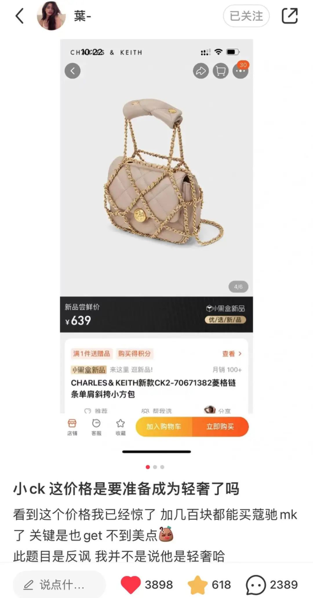 自称“快时尚中的奢侈品”,被称为“鞋包品牌中的ZARA”的 Charles & Keith 不是传统意义上的奢侈品。留言者认为将炫耀包包模式用在这个品牌上颇为滑稽。