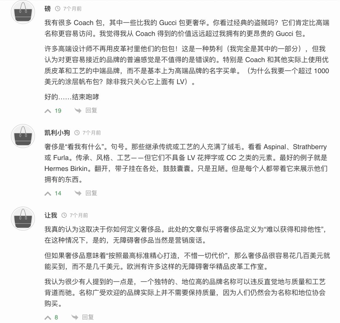 一个讨论“是否真的存在轻奢”的博客下,聚集了不少质疑大牌的声音。有人觉得轻奢 Coach 包包比 Gucci 更好,反正现在大牌设计师也不用皮革内衬了。