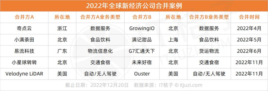 与企业并购「大吃小」不同,企业合并更多的是强强联合以提高行业竞争力。IT 桔子数据显示,2022 年新经济领域共发生公司合并事件 5 起,较去年减少 3 起。合并交易涉及交通制造、电商、企业服务等多个领域。