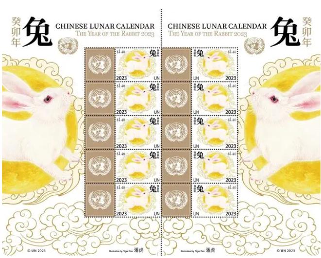 除此之外,联合国邮政管理局也将在2023年1月20日在纽约发行中国农历癸卯兔年特别版邮票版张。据了解,邮票左半部分为联合国会徽图案,右半部分为中国设计师潘虎创作的“月兔”图——用工笔描绘出了一只生机勃勃的白兔,背景则是祥云围绕的金色月亮。