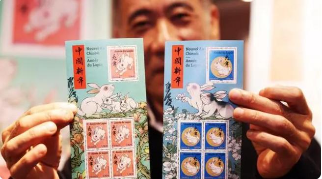 无独有偶,1月14日,法国邮政公司在巴黎举行中国兔年生肖纪念邮票发行仪式。由法国华人艺术家陈江洪设计的兔年生肖纪念邮票共有两款,一款邮资1.16欧元,另一款邮资1.80欧元;两款邮票的票面上方和下方分别用法语和中文标注着“兔年”字样。