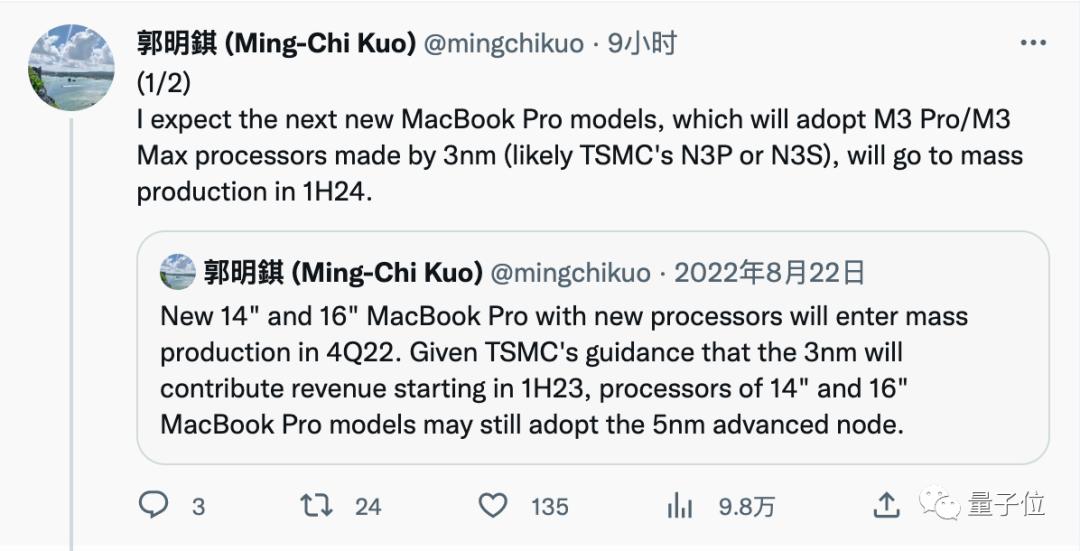 天风证券分析师郭明錤预测,M3 Pro/Max将升级至3nm制程工艺(可能是台积电N3P或N3S),2024年上半年量产。