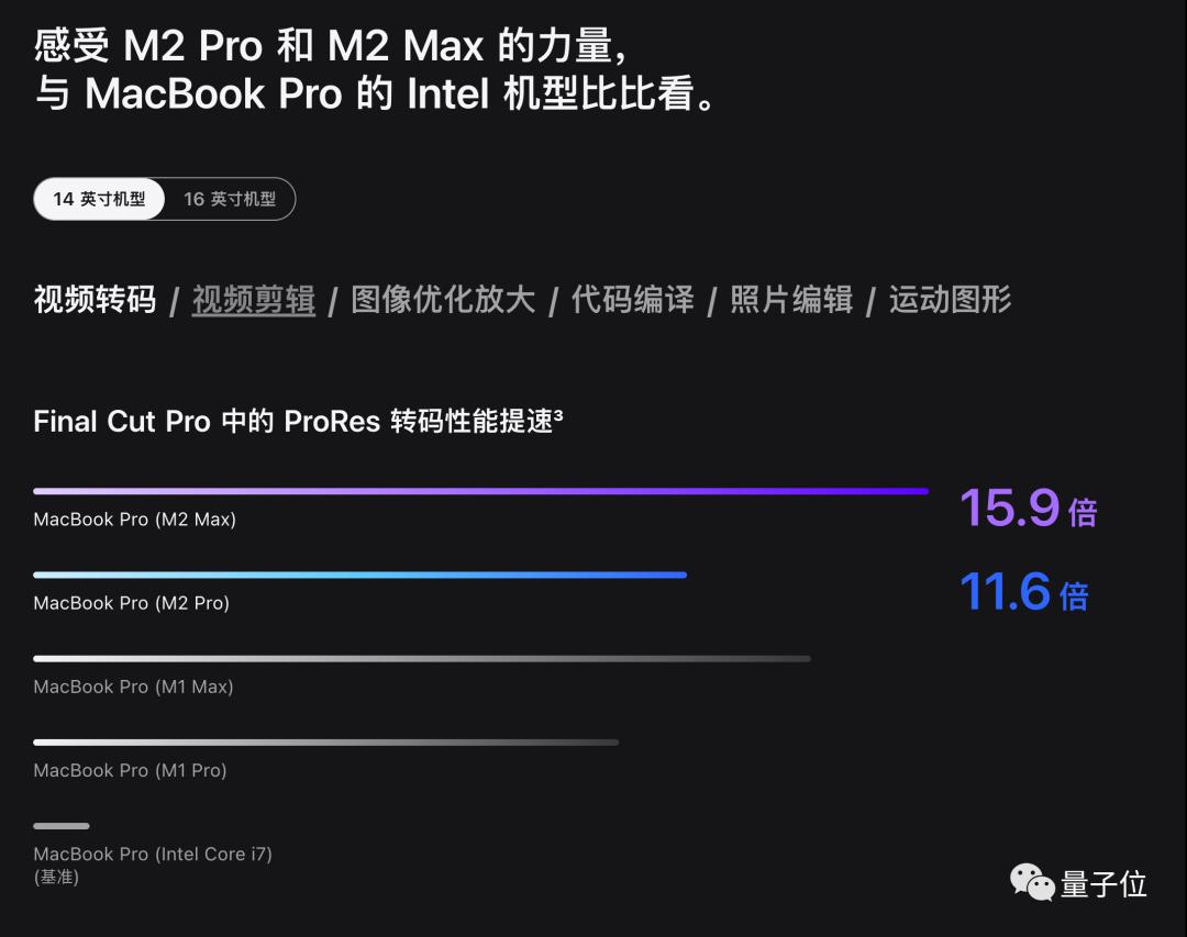 发布视频和产品页面上,苹果还是在欺负老款Intel i7芯片,都没好意思和上代M1 Pro/Max直接对比。
