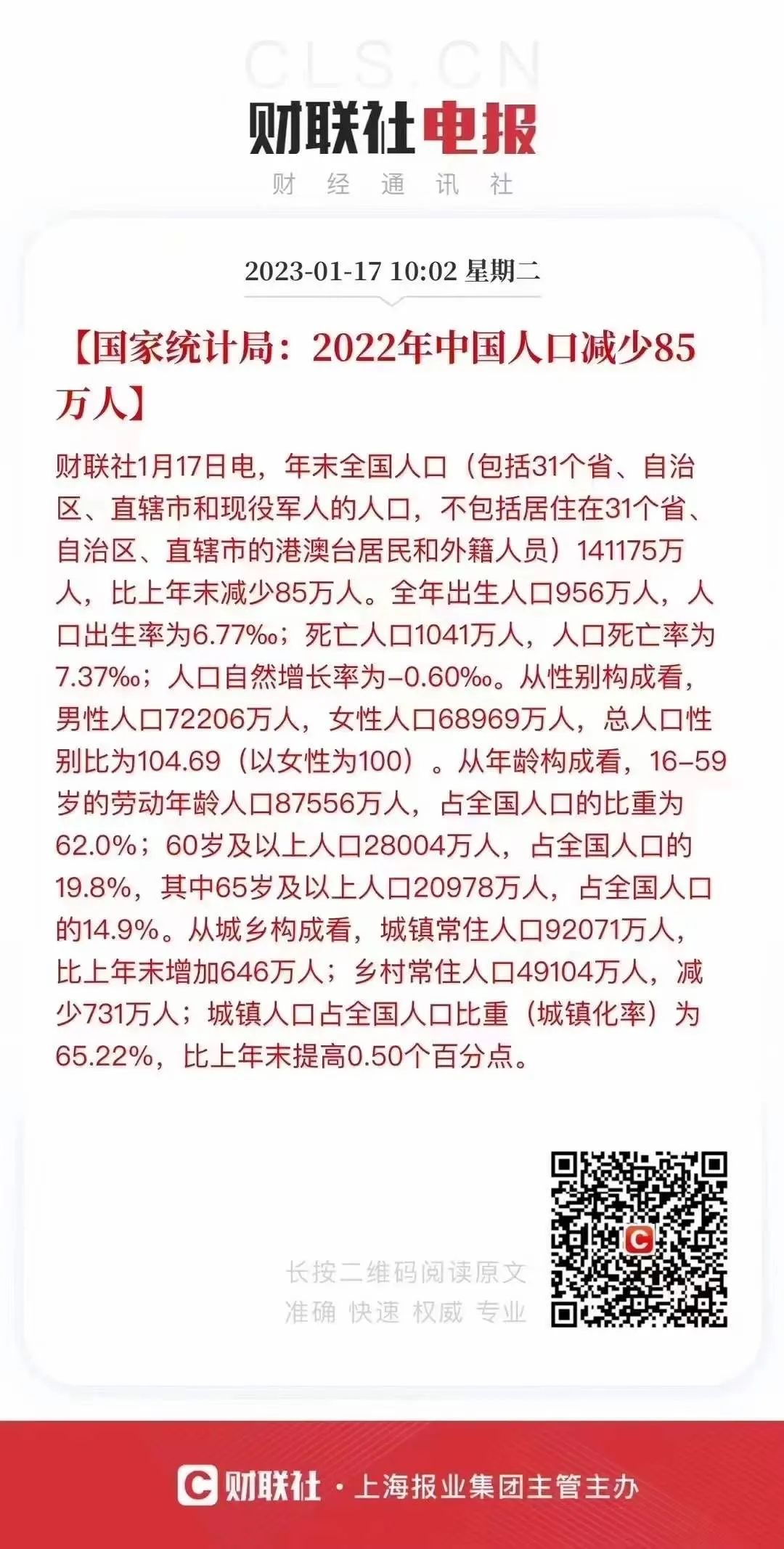 1月17日,国家统计局发布了两个重要指标,2022年国内生产总值1210207亿元,按不变价格计算,比上年增长3.0%。同时,国家统计局局长康义介绍,去年末全国人口141175万人,比上年末减少85万人。这也是我国人口自1962年以来(即61年来)首次出现负增长,2022是中国人口正常环境下负增长元年。