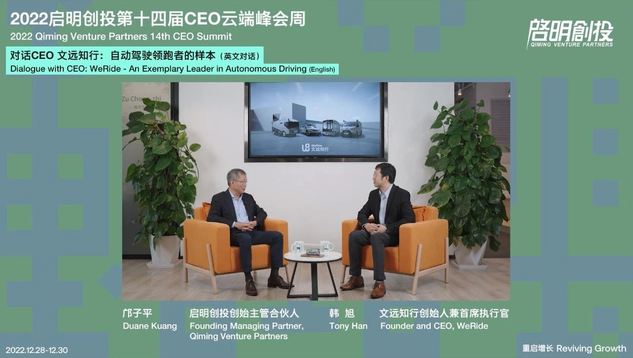 围绕“自动驾驶领跑者的样本”这一主题,启明创投创始主管合伙人邝子平与文远知行创始人兼首席执行官韩旭展开深度对话,分享了公司主要五大产品线的进展,团队建设和企业文化理念,以及对未来自动驾驶应用的展望。谈到对文远知行的愿景,韩旭表示,希望文远知行不仅是开发很酷的自动驾驶技术,更是研发出真正成熟的产品,在普通人的生活中发挥价值,帮助解决人类社会的问题。