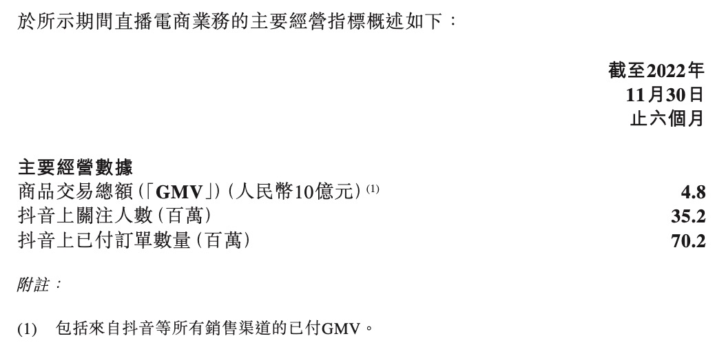上述财报披露了自东方甄选直播间爆火以来,新东方在线的详细财务数据。财报显示,2022年6月至11月,新东方在线商品交易总额(GMV)达到48亿元;抖音关注人数为3520万;抖音平台已付订单数7020万。