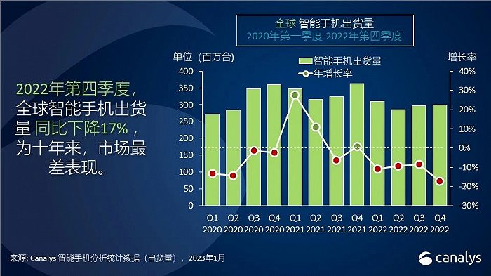 1月18日,市场调研风向标Canalys发布的全球智能手机最新报告显示,2022年第四季度成为全球智能手机市场十年来表现最差年份的最差季度。